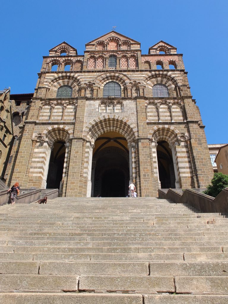 Le Puy-en-Velay mit seiner Basilika, die schon auf römischen Tempeln aufbaut und die steilsten Stufen bis zum Altar hinauf besitzt, und wie nahezu alle Basiliken und Kirchen der Auvergne sind ihre Türme aus dem dunkelroten bis braunen Lavastein gebaut, ergänzt mit Säulen aus grauem Basalt und Schmucksteinen aus rotem, gelben und fast weißen Sandstein.